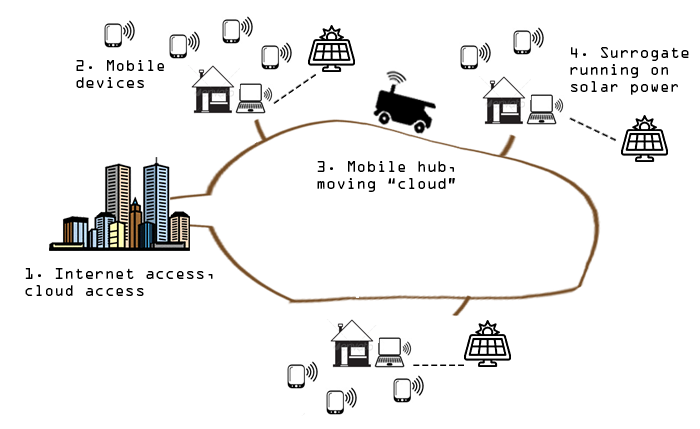One need in countries with weaker national connectivity is to support data intensive, computational processing tasks without connecting to (or assuming a connection to) a high capacity data centre such as AWS Us-East. Often these countries have decent cell networks but poor computer/data networks. Thus surrogates for data collection are usually cell phones or Raspberry PIs, with limited on-device processing and storage. An Edge computing approach could periodically retrieve data from the surrogates and then upload it to a data centre (possibly by driving it in via “SneakerNet”).