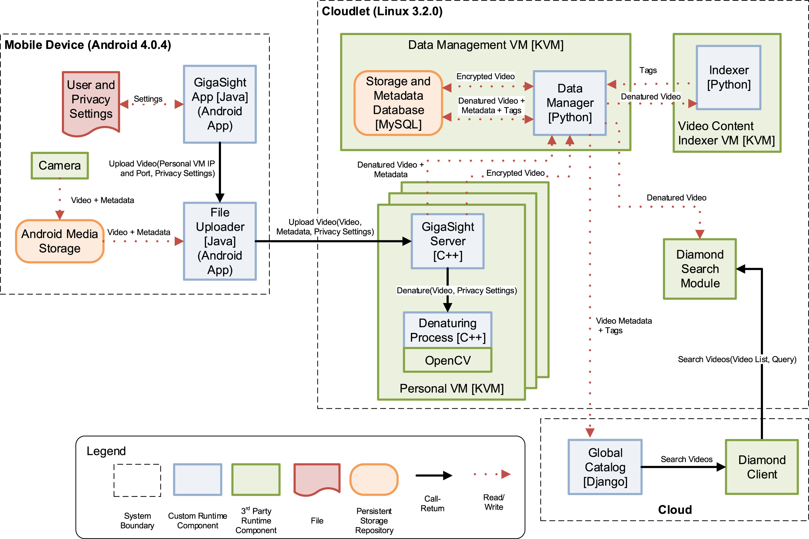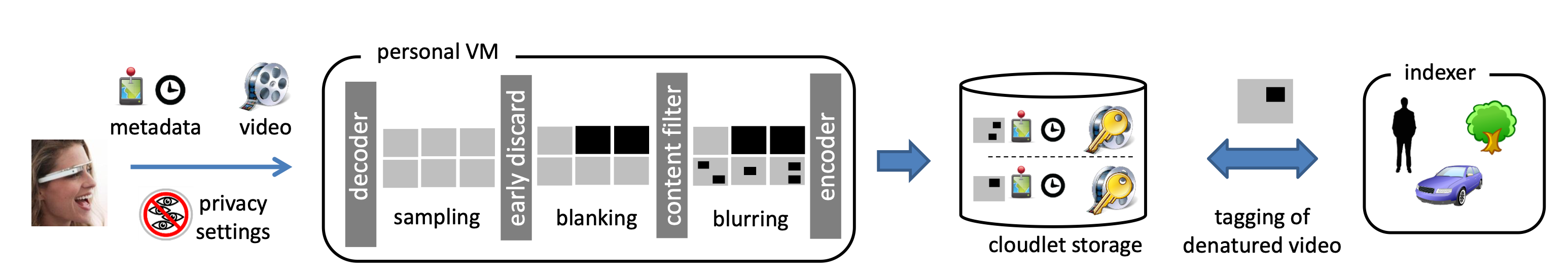 GigaSight is a cyber-foraging system targeted at continuous collection of crowd-sourced video from mobile devices and wearables [7]. Given the potentially-sensitive nature of video, GigaSight collects video on surrogates called cloudlets where privacy-sensitive information is automatically removed from the video based on user-defined privacy settings related to time, location, and content — a process called denaturing. Denatured video is then indexed and resulting tags and metadata are uploaded to a cloud catalog where users can perform content-based searches on the total catalog of denatured videos.