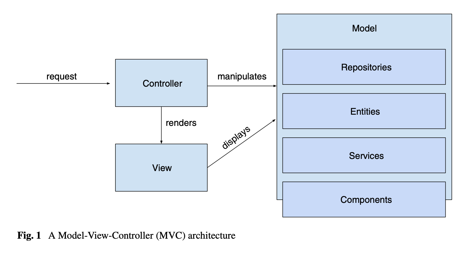 Aniche et al (2018) investigated code smells for MVC architectures. They proposed the following 6 smells in MVC, using the architectural description shown below: