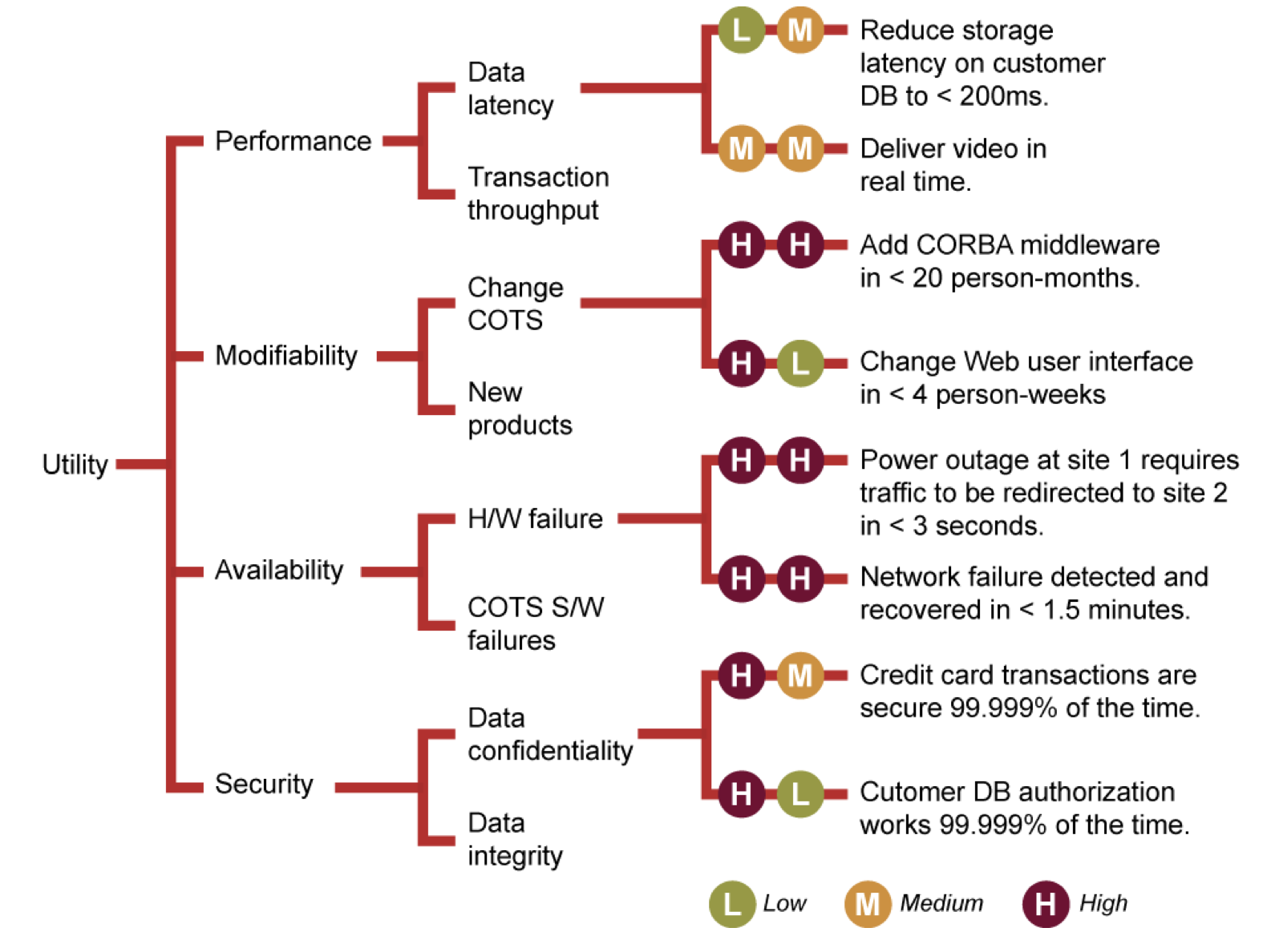 A utility tree shows the prioritization of quality attribute requirements, realized as scenarios.